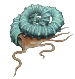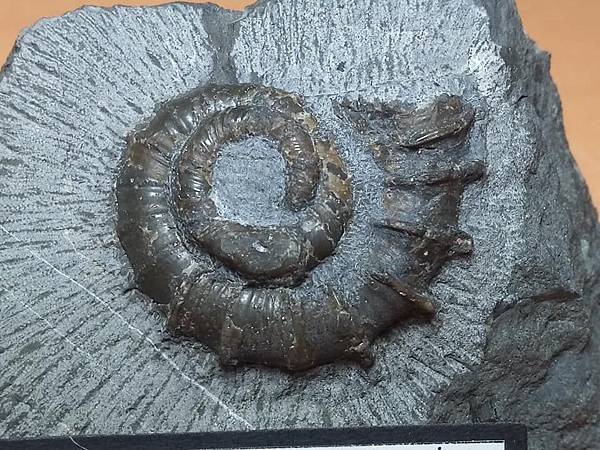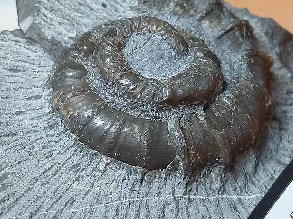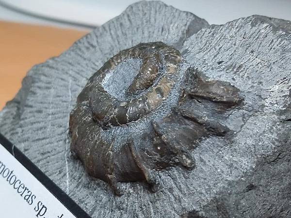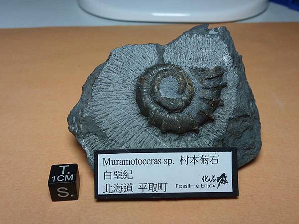 Muramotoceras的Muramoto是村本的日語發音,所以我翻譯作村本菊石,用以紀念業餘化石研究生的村本鬱夫先生。村本菊石是異常捲曲菊石的一種,它以3D螺旋線盤繞,但成年後變成2D平面的平卷。這一件村本菊石還明顯看出它不是平卷、內外圈還是有高低落差,然而落差高度不是很高,因此可能是接近成年人的個體。
