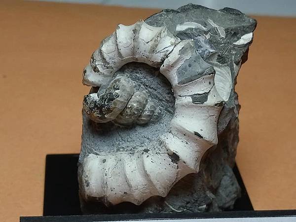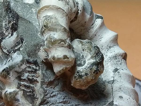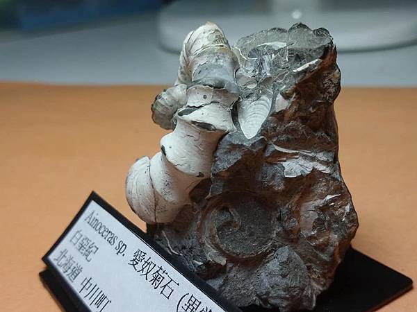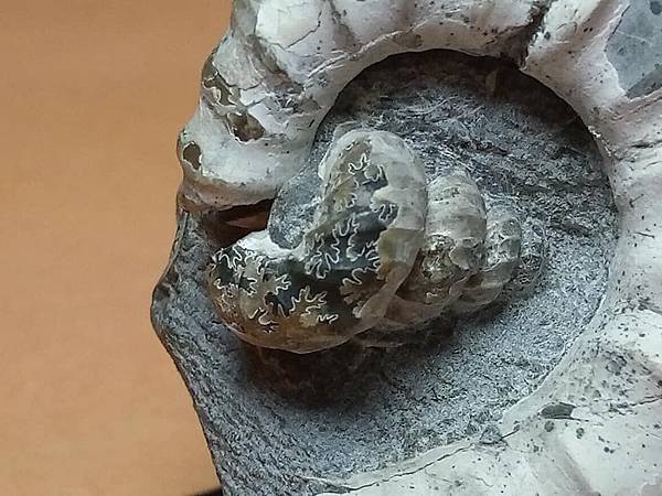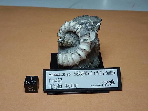 Ainoceras アイノセラス的アイノ是北海道原住民愛奴族的意思,現在比較常翻譯成阿伊努族,兩個字比較簡潔有力,所以我把它翻譯成"愛奴菊石"。愛奴菊石中心殼呈螺旋塔狀,像似馬瑞拉菊石(一種塔螺狀的菊石),年輕時候這個塔狀會很突出,但中年以後由於外環殼變大變粗,內環塔狀殼逐漸被包圍與外環殼齊平。這個標本看起來是一個相對年輕的個體。