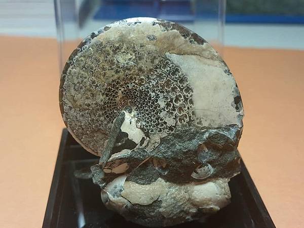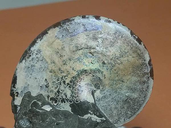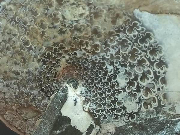 其實要介紹縫合線的葉部及鞍部用楔碟菊石是很不適合的,因為楔碟菊石是我看過最密集最複雜的縫合線,尤其越靠近臍心,縫合線更加密集、密集到找不到葉部(我找到眼睛快花了)而變成連續鎖鏈紋,所以不容易觀察,但也因此楔碟菊石被認為是有最美的縫合線而廣受喜愛。如圖三是楔碟菊石離臍心較遠的最外圈縫合線,上方箭頭方向朝向住房是為鞍部、下方箭頭朝向螺旋殼的方向是為葉部。大家若有興趣不妨拿起自己手邊的菊石觀察看看是哪種type的縫合線? 順著縫合線的走向找出葉部及鞍部! 這也是玩菊石的樂趣之一喔~