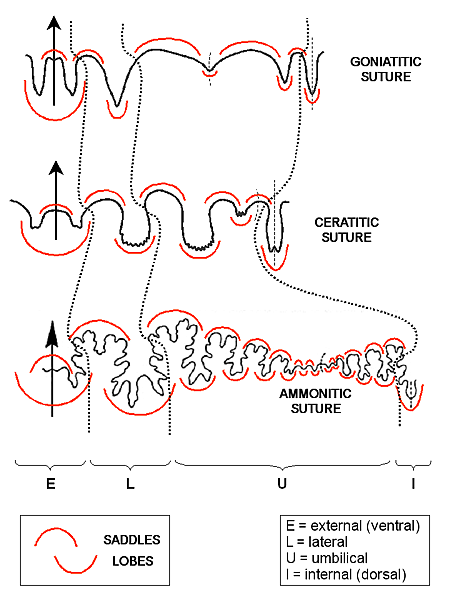 為了把菊石分類,把縫合線分為基本三種型態:棱菊石型(goniatitic)、齒菊石型(ceratitic)和菊石型(ammonitic)。最早的菊石具有更簡化的縫合線,但當第一個真正的菊石在二疊紀登場時,趨向複雜化的縫合線設計將持續數百萬年。一般而言,最初的古生代泥盆紀菊石到二疊紀是棱菊石型的簡單折線形縫合線;古生代後期的密西西比紀到二疊紀、再到進入中生代三疊紀少數的菊石是過渡的齒菊石型,它的葉部(lobe)縫合線呈現小鋸齒狀、然後整條縫合線呈現大鋸齒狀而得名;二疊紀以後有菊石型縫合線的真正菊石開始出現,隨後進入到中生代三疊紀及菊石的輝煌盛世侏儸紀及白堊紀,隔間壁的發展趨向劇烈扭曲而顯現在殼上的就是複雜或密集型圖案的菊石型縫合線(三種樣式、葉部、鞍部,如最後網摘圖)。