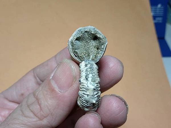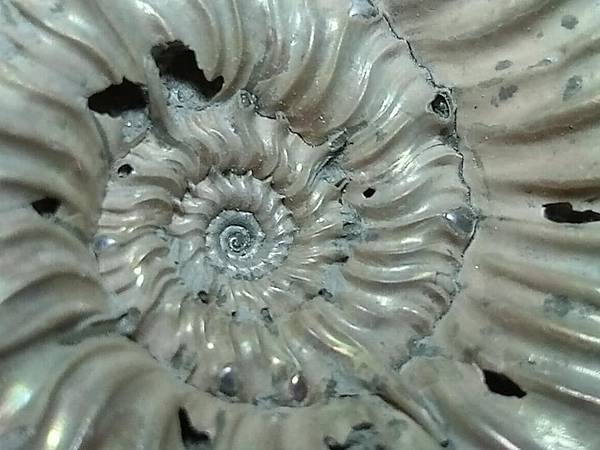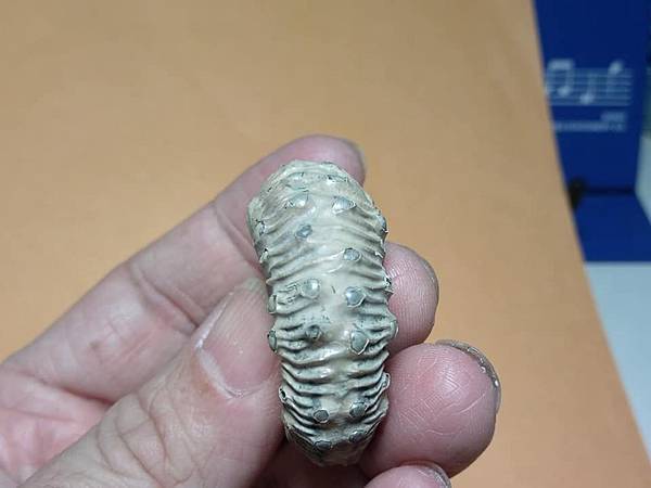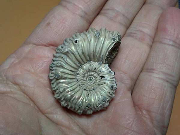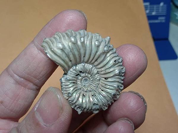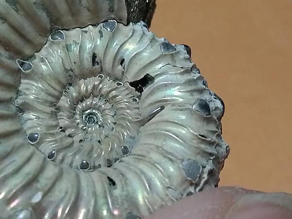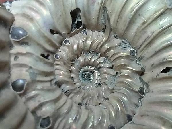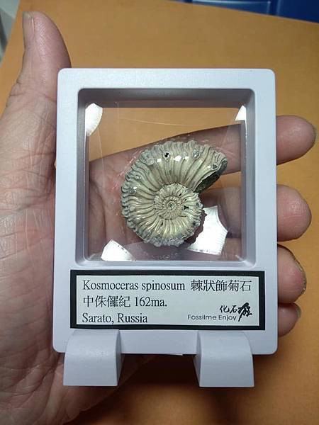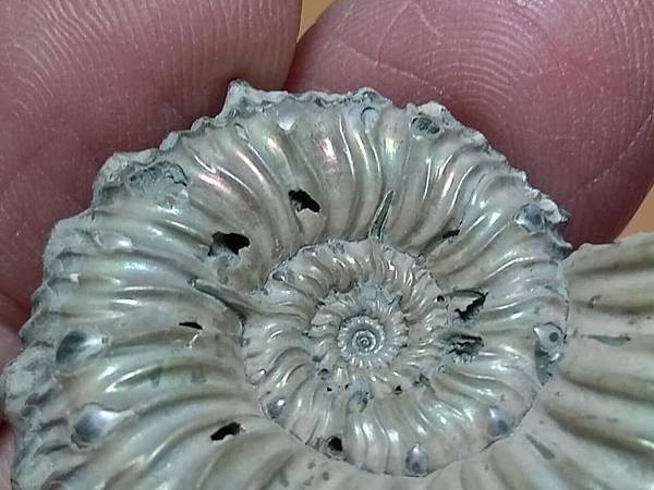 這顆俄羅斯的黃鐵礦飾菊石保留原生殼,所以隨著角度的不同會有彩遊現象。 另外一個重點是肋條上面的棘突非常發達,甚至於臍心內圈都還長有很明顯的棘刺(如圖一二),正反面也有一兩根特別長的棘刺保留(圖三四)。會有這麼多棘刺的菊石,想必是威嚇捕食者,明確告知"我不好吃,不要來吃我"😅😅