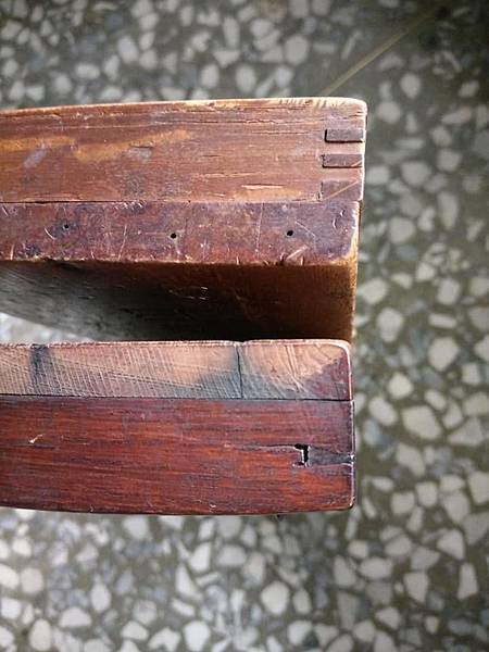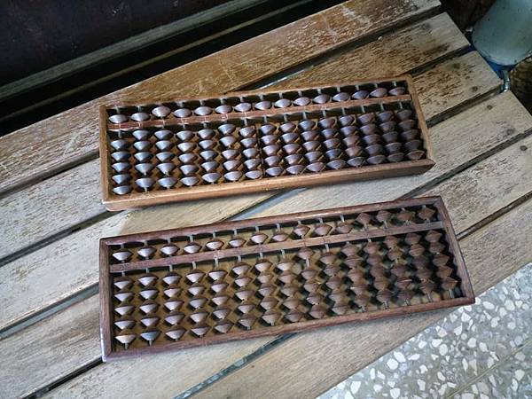 這兩個老算盤是很照顧我的前輩送我的,一個是日本的,一個則是前輩老家是旗山老街的中藥店傳下來的,所以是正老台灣的。 來看看台灣跟日本的差別,台灣是指接榫相接、日本則是單個鳩尾榫(如圖),另外台灣的背板是檜木、日本的似乎是梧桐木(如圖)。哈哈~最大的分別是日本的通常背板都有大大的字啦! 感謝前輩的贈送。