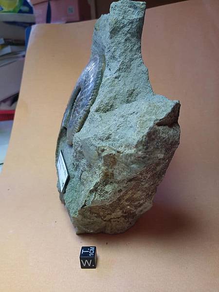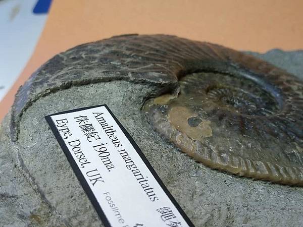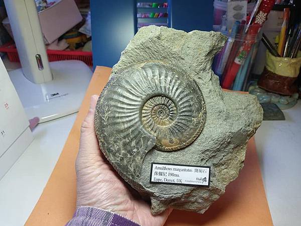 英國產的繩菊石、頗大(如圖黑豆及手的比例),清的很漂亮,母岩裁切適當好擺飾。 重點是把它的特徵-繩子狀的腹側都保留下來,繩菊石就是以繩狀的腹側得名。