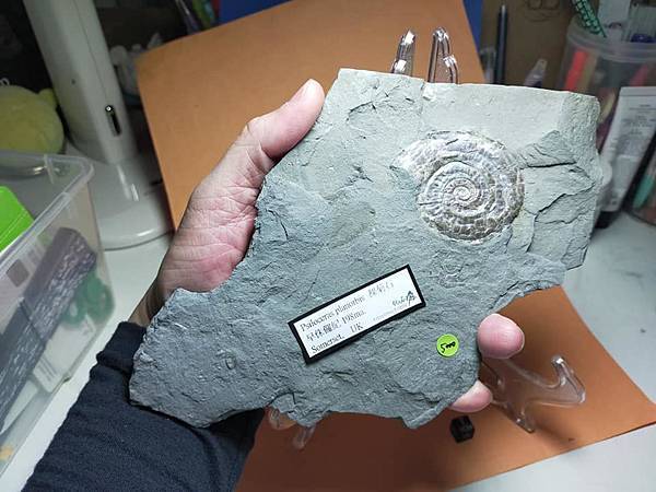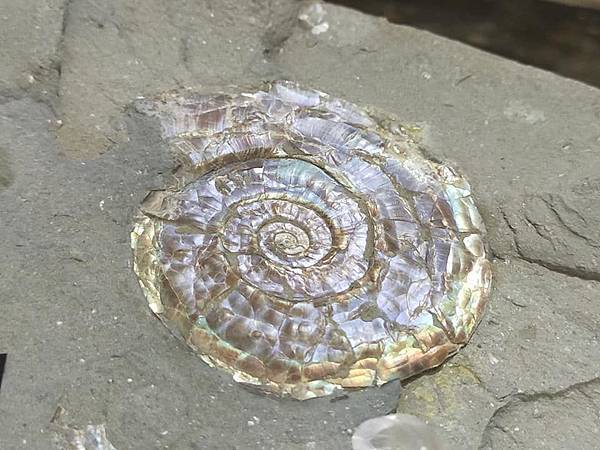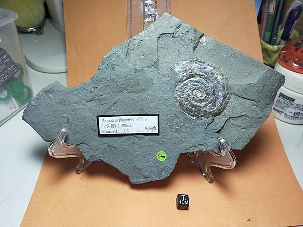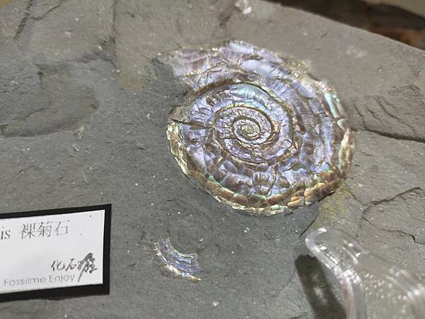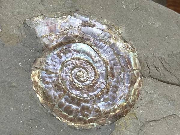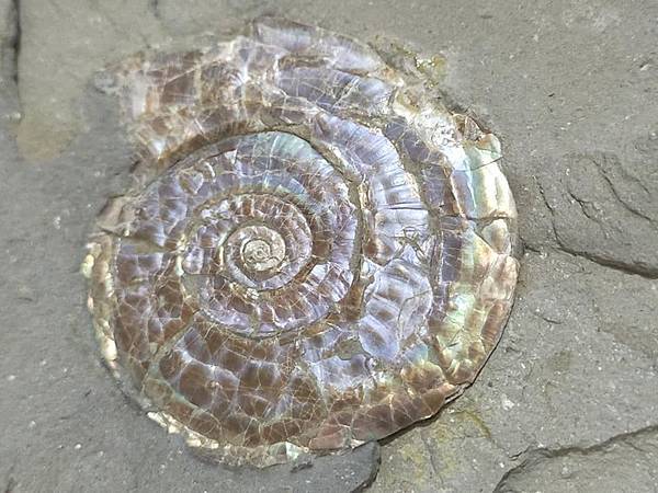 裸菊石(Psiloceras planorbis)也是英國的經典菊石之一, 以外殼光滑而得名,實際上它是整顆被地層壓扁,菊石內的構造包含縫合線、隔間壁、氣室等都被破壞無遺,所幸殘留薄殼並發出彩遊光而受到喜愛。