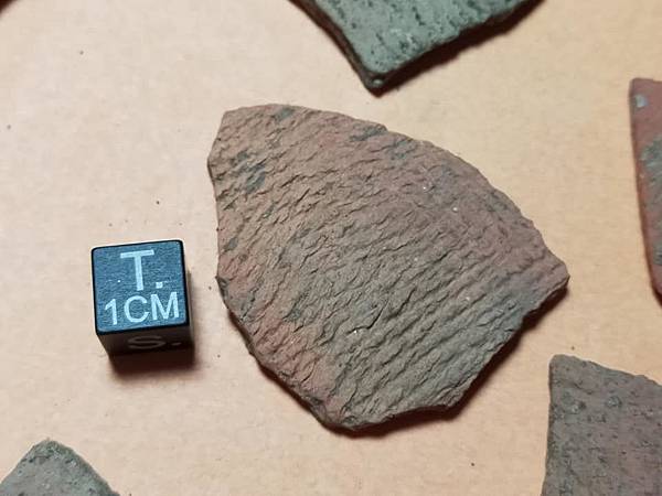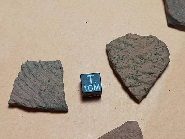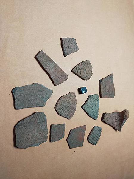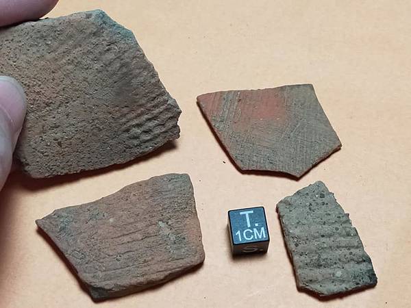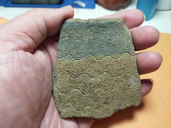 上週六帶小朋友去考古,撿了這些有紋路的陶片,特別的是有水波紋的陶片,波紋很規則,不知道古早民藝是如何做到的? 其他則是比較雜亂的紋,應該很容易辦到。