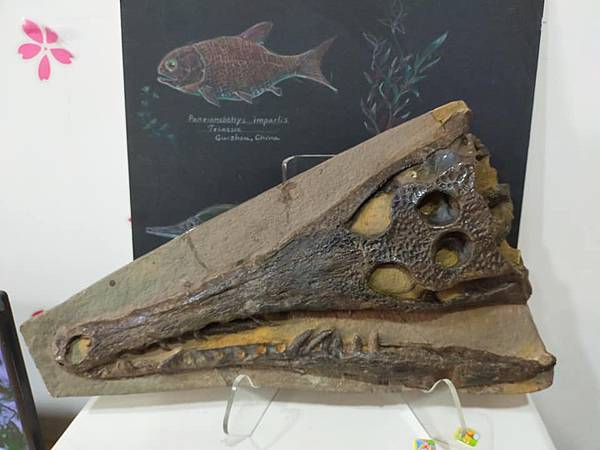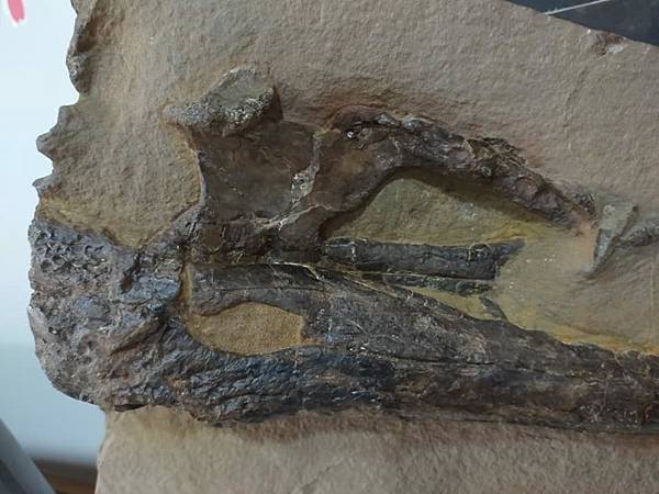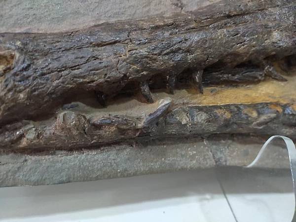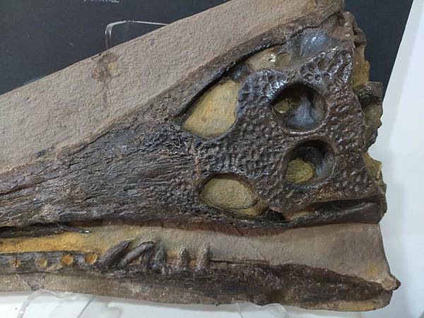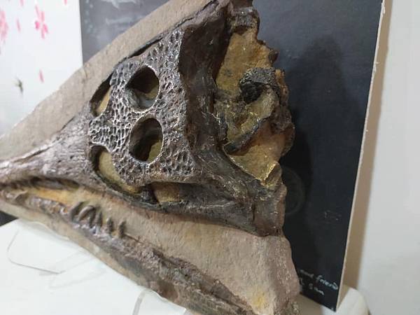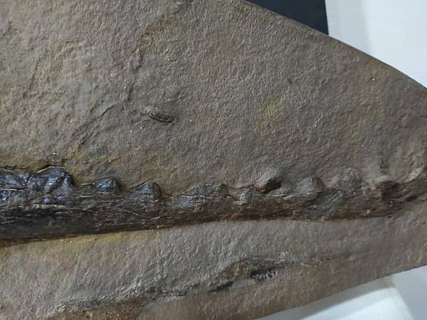 這件長吻鱷鱷魚頭母岩有缺損,用石膏補;牙齒及骨頭也有缺損,也是用石膏補,石膏是白色,所以補完要上色,等全部都修理完後,再用固化劑整體保護。這樣的過程就是restoration,把缺的東西用材料補上去。恐龍骨化石也是這樣修、俄羅斯三葉蟲也是這樣修,所以restoration對化石清修而言再正常不過了,只是一般化石商品不會主動告知,可能是因為他們也不懂或是他們覺得這是正常的,不需要告知,所以搞不好大家收藏的化石或多或少都有修補。我買化石這麼多年,唯一會跟你說修補比例的大概就只有俄羅斯三葉蟲。我的東西,只要我知道有什麼修補,我都會告訴你,就如同這件化石。但這件化石是我交給專業清修師清理的,過程中我只有看到一些地方有白色的石膏,然後收到後就是這樣令人驚喜的樣子了。除此之外,清修師還在母岩背面清出鱷魚的下顎來(如圖),真是額外的驚喜及收穫。清修師還跟我說本來想把鱷魚頭清成立體的、摟空的,但這樣我就很滿足了......專業的清修跟我這種只會用氣動筆及電動雕刻筆的,真是差別很大啊!!