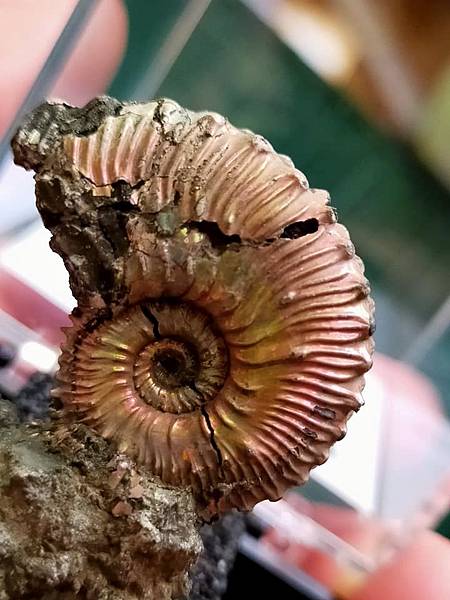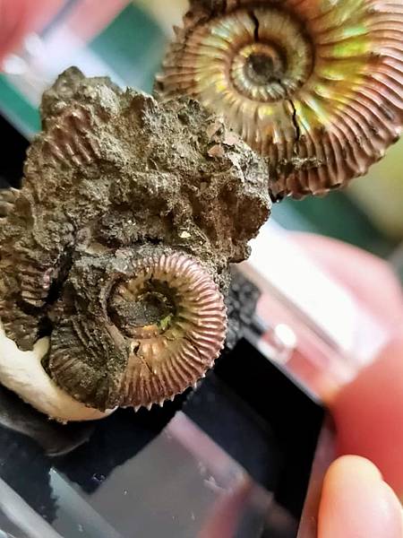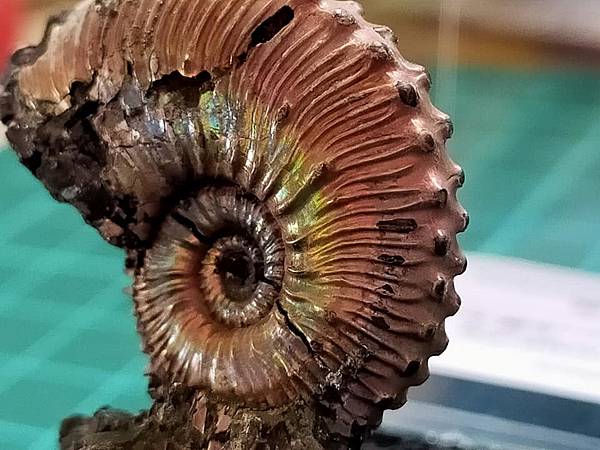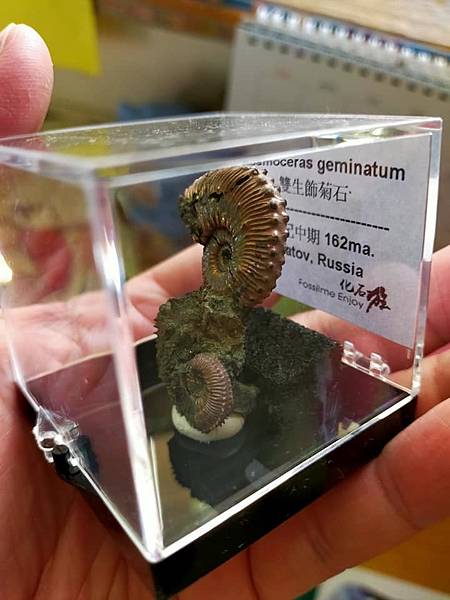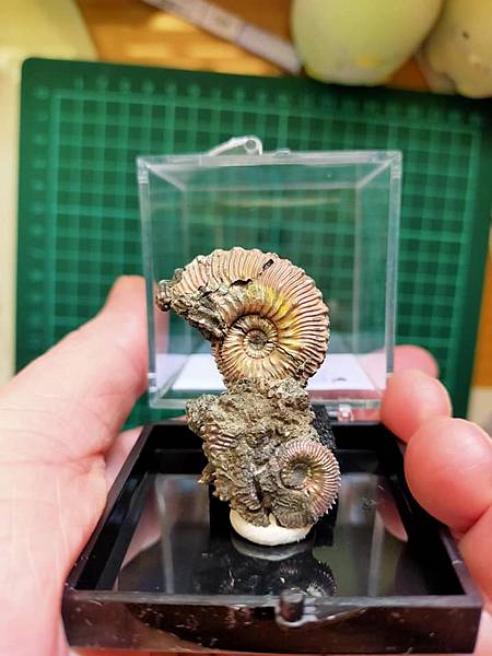 這是一個黃鐵礦化的飾菊石,保留外殼所以會有漂亮的彩遊現象。屬名是雙生,剛好這個標本有上下兩顆飾菊石,恰好符合雙生這個屬名。