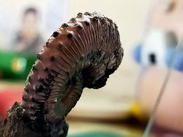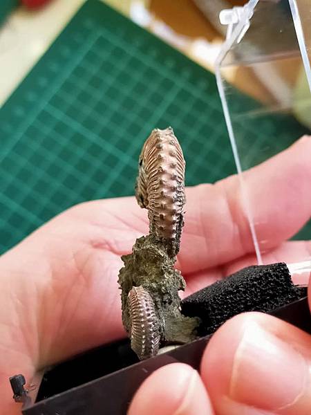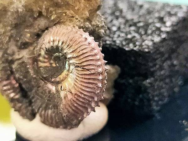 這兩顆飾菊石有很好的細節,例如稍嫌複雜的肋條、腹側兩排的棘突,雖然因為地層擠壓使得黃鐵礦外殼有裂痕及破碎,但整體瑕不掩瑜,是我很喜歡的標本。