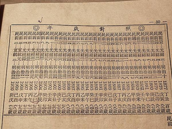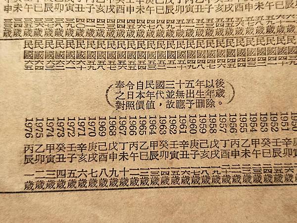 還有最重要民藝人的年代工具:民國、日治、天干地支的年代對照表,下方有寫"奉令民國35年光復後把日本紀年刪除";
