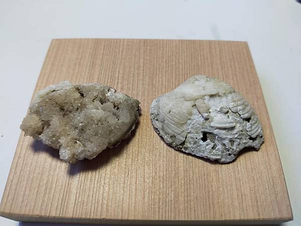 圖6左邊是外殼溶蝕,露出米粒狀結晶,右邊是保留外殼,上面有些許的方解石化,兩個都是二枚貝