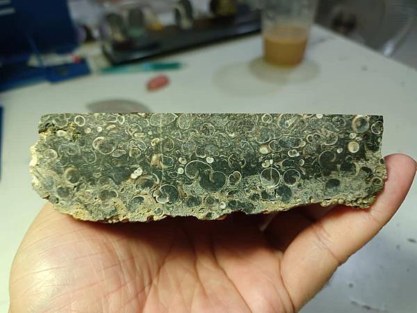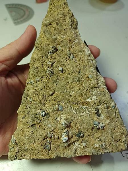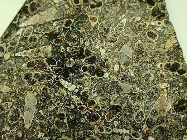 母岩上滿滿的、玉髓填充的淡水螺類(Elimia)。這種岩石被稱為”塔螺瑪瑙”,但是實際上裡面的螺類不是生活在海裡的塔螺而在生活在淡水的種類、填充螺的礦物也不是瑪瑙。裡面螺類的名字也有被取做”Goniobasis tenera”, Elimia和Goniobasis 哪一個的名字是有效的?好像還沒解決。