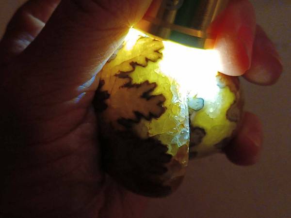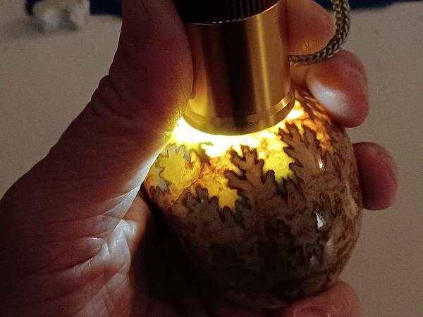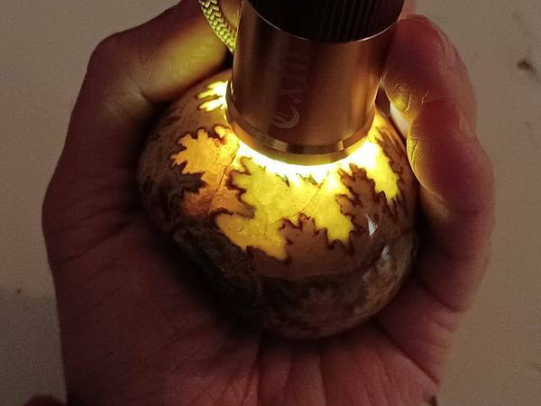 這顆球菊石則來自英國懷特夏郡,全身方解石化,燈光照下去透光顯現出縫合線非常美
