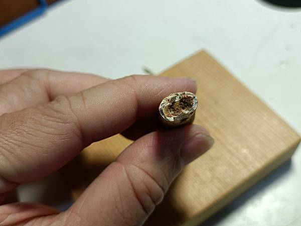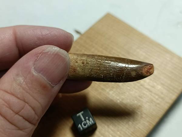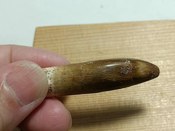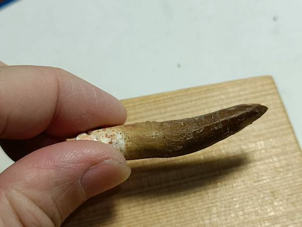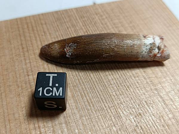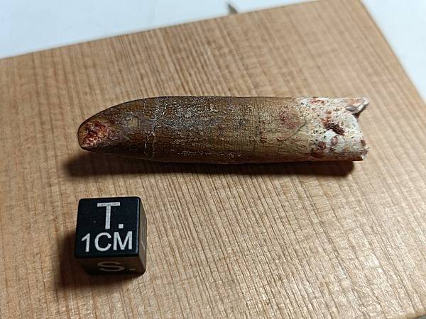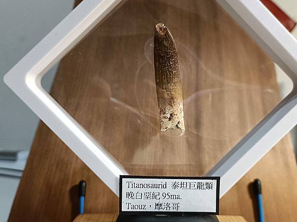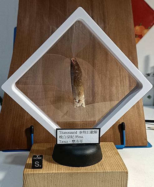這顆牙齒來自一頭大型摩洛哥泰坦龍,目前身份不明。這顆牙齒有修復,但修的自然看不太出來痕跡。