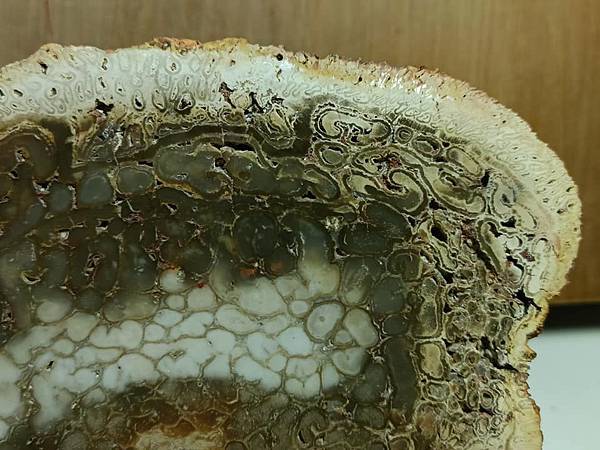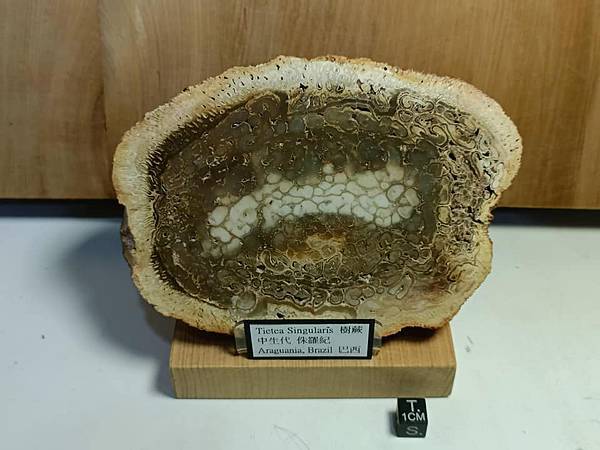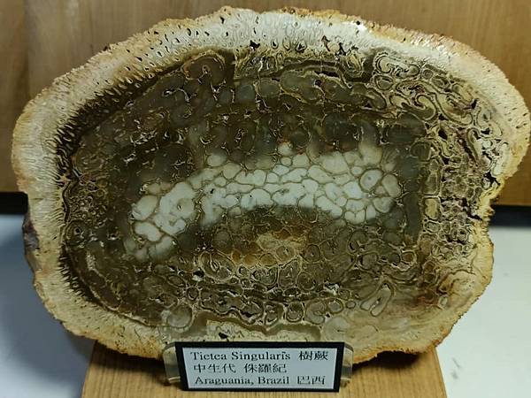 當今世界上的蕨類植物絕大多數是草本,地球上高大的木本蕨類植物曾經有過興盛與衰亡的歷史,僅有少數木本蕨類活下來,稱為樹蕨。樹蕨依中心部向外依序為1.後成木質部(metaxylem)乃指稍後成熟之初生木質部,其位於維管束中柱中央,具加厚之次生細胞壁與導孔。2.原生木質部(protoxylem)3.韌皮部(phloem)4.皮層(皮層)5.厚壁組織(sclerenchyma)6.覆皮部(mentle)。但實際上對照這塊化石的切面還是很難分清楚各部位構造。