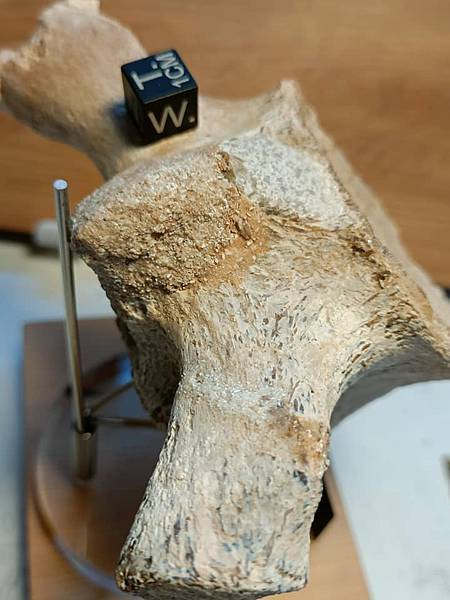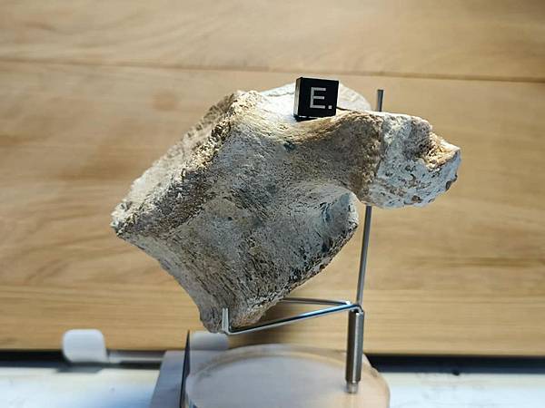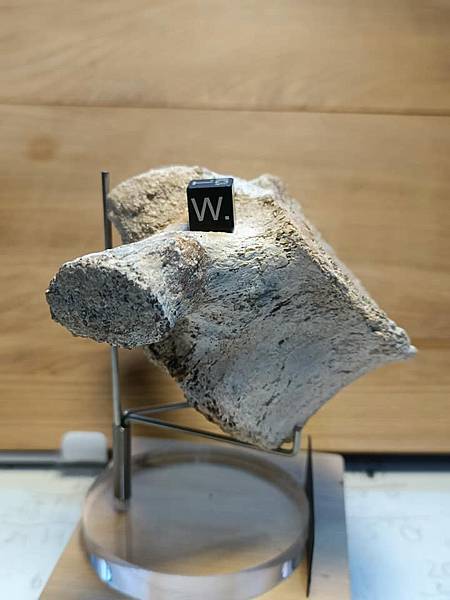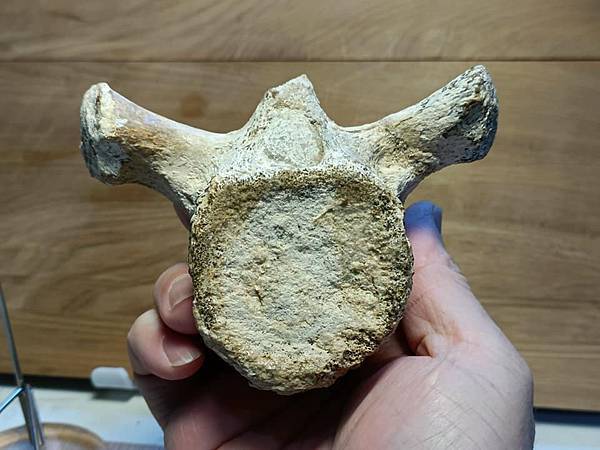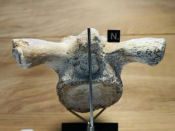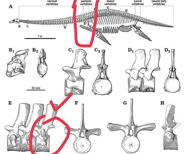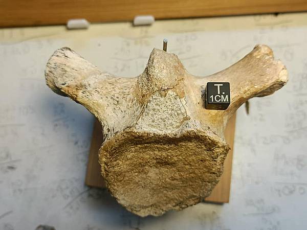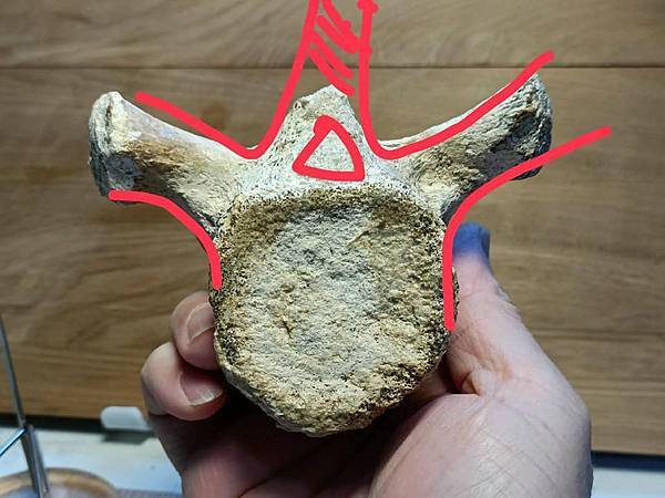 此件標本少了椎骨中間隆起的神經脊,但是根據兩翼及脊椎孔(被填充沒有清出來)的相對位置對照後面的網摘圖,應該是E的位置,也就是胸椎。
