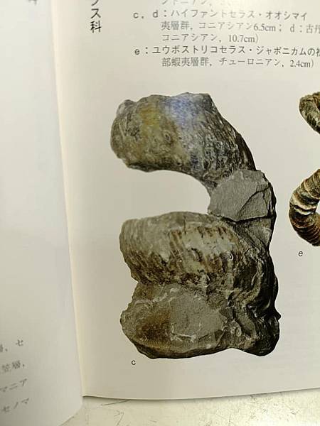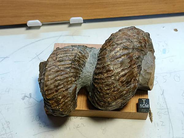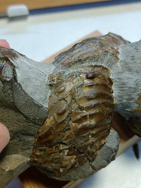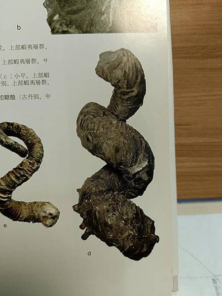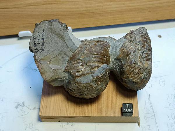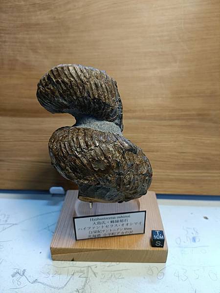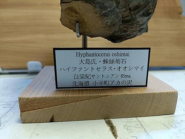 原來腹側有四列的突起是蛛絲,但是一般所見細長麻花卷是東方蛛絲菊石,這個標本是大型且粗壯的螺旋殼體上也有四列突起,是為大島氏蛛絲菊石,較為罕見的物種。