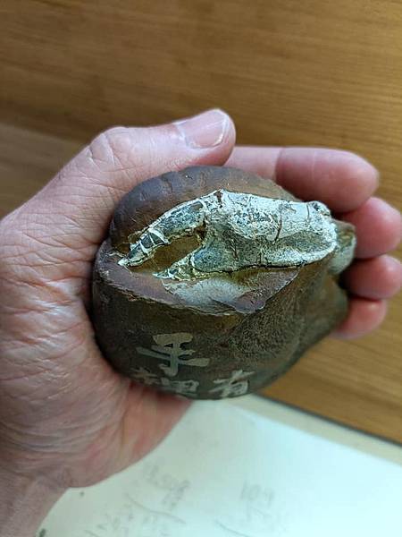 一顆大結核上端清出螃蟹蟹螯(鉗子)的化石