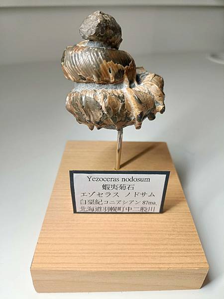 蝦夷菊跟蝦夷船都是異常卷曲菊石。蝦夷菊石呈塔螺狀,卷曲會稍微鬆開,腹側邊緣會有小棘,最大的特點是住房的外殼會有誇張裙擺狀突起的主肋、主肋側邊會有圓形結節,這個結節上面可能會有棘或疣,在清修過程中通常斷掉難以留住,就露出黑色發亮的結節。蝦夷菊石算是非常稀有,這件本人大約花了兩個禮拜整理,盡量把小棘、疣等細節清出來,加上檜木座、細小鐵棒、說明牌等,希望能好好呈現它的特別與珍貴。