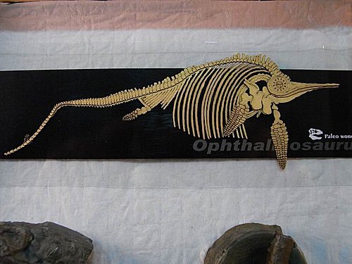 德國的魚龍非常有名,這個標本是一小節魚龍脊椎的骨盤及兩根細骨所組成。其中盤狀中間凹陷的椎骨盤相傳以前古人還不知道化石這東西時,在中間注入燈油及心蕊,拿來當油燈呢!很有趣吧。